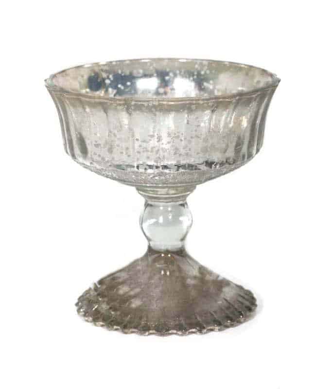 The Silver Mercury Glass Bowl on Pedestal with Lines features a stunning design that effortlessly elevates any decor. Its elegant silver finish and intricate line detailing create a visually striking centerpiece, perfect for enhancing the ambiance of dining tables, mantels, or special event settings. The 4.5″x4.5″ size makes it versatile for various uses, from showcasing floral arrangements to serving snacks, embodying both beauty and functionality.